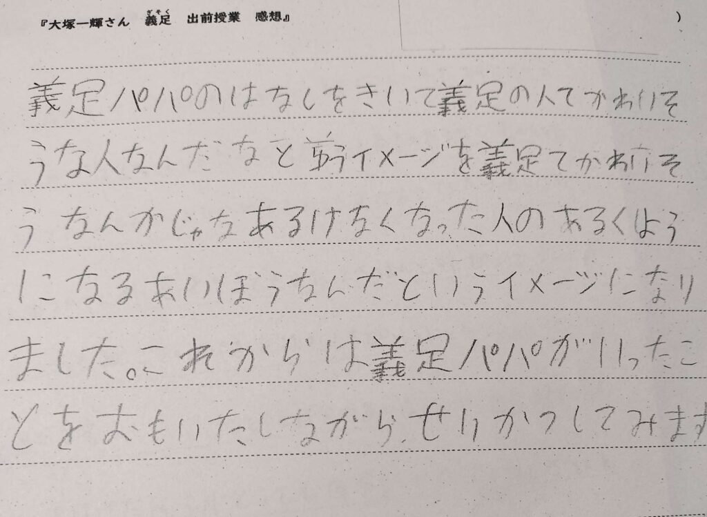 講演後に寄せられる感想文には、「最初はこわかったけれど、話を聞いて気持ちが変わりました」「見た目で人を決めつけるのはよくないと思いました」「つらいことがあっても、あきらめずに挑戦したいです」といった言葉が並びます。そこには、多様性を認め合う気持ちや、自分自身の壁に向き合おうとする前向きな姿勢が表れています。